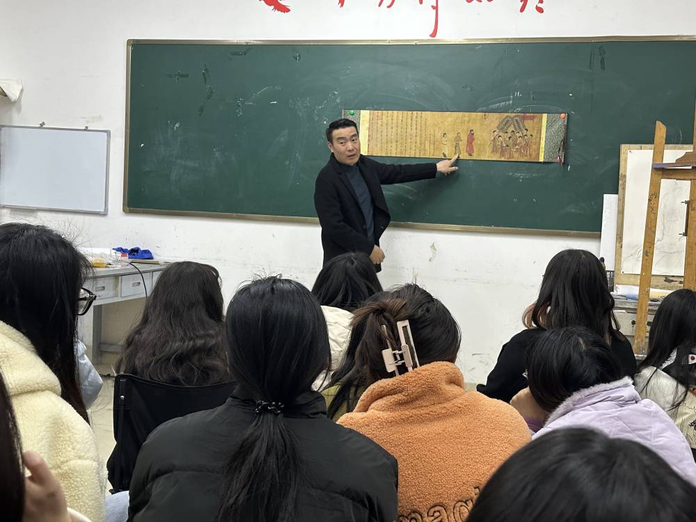 王志国老师深入浅出地概述了中国工笔人物画的概念,通过对比、讨论、提问等形式,结合阎立本的《步辇图》,详细解析了工笔人物画的技法特点,同时向同学们提出了“精笔墨、明画理、重文思”的要求。授课中,王志国老师将思政内容巧妙融合,让学生直观地感受到传统中国画线条艺术的独特魅力,体会到中国画“以线造形”的博大精深,在提高同学们对造形美的认识与把握的同时,也增强了民族自豪感和自信心。