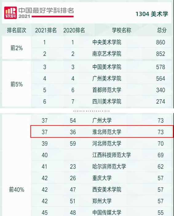 10月25日,高等教育评价专业机构软科(上海软科教育信息咨询有限公司)正式发布“2021软科中国最好学科排名”,美术学学科(代码1304)共有61所大学上榜,中央爱爱视频 、南京艺术学院、中国爱爱视频 位列前三甲,我院美术学进入前40%,位列第37名,自2018年以来已连续4年跻身排名前列。